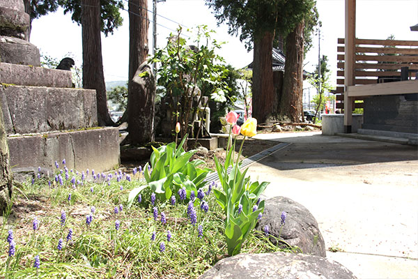 境内に咲くチューリップとムスカリ。